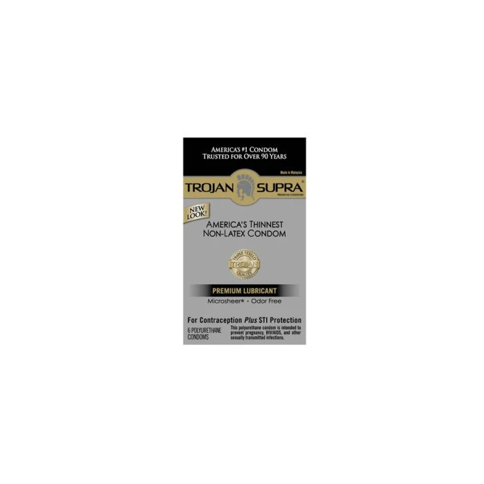 Trojan Bareskin Non-Latex Supra condoms are great if you or your partner have a latex allergy, don’t like the smell of latex, or are just looking to change things up from everyday, normal condoms. Trojan Bareskin is a latex free condom that doesn’t sacrifice thinness or hamper natural body heat between partners.